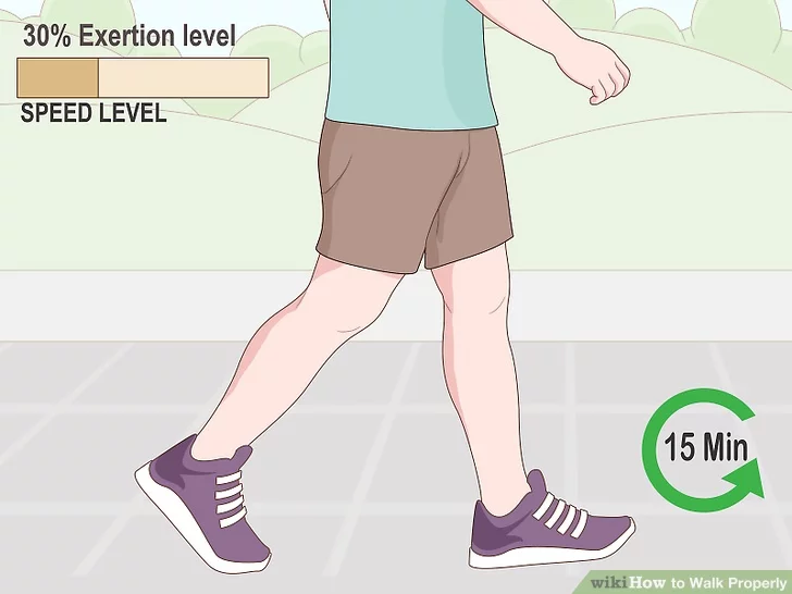 Trong vài phút đầu tiên khi đi bộ, hãy giữ nhịp điệu đều và thoải mái đến khi cơ thể bạn nóng lên. Giả sử rằng 100% là tốc độ tuyệt đối nhanh nhất mà bạn có thể đi bộ, hãy thử đi bộ với khoảng 50 – 60% mức gắng sức này cho phần khởi đầu. Bạn cũng có thể nói chuyện bình thường mà không bị hụt hơi trong quá trình khởi động. Cách thức này đã được chứng minh là giúp tăng hiệu suất trong quá trình tập luyện tim mạch.